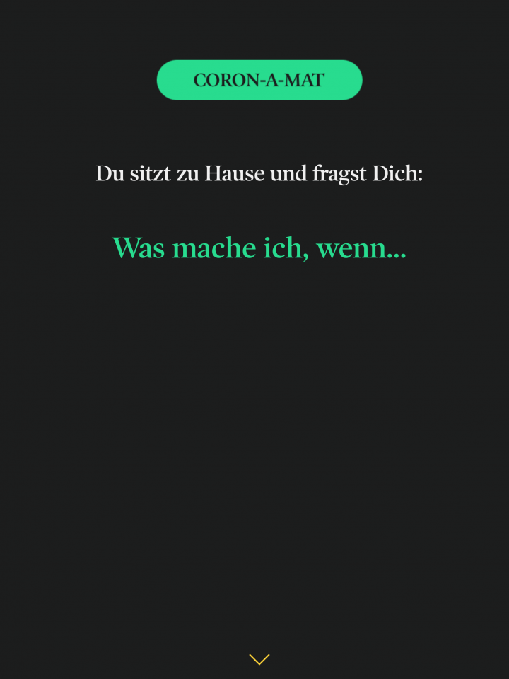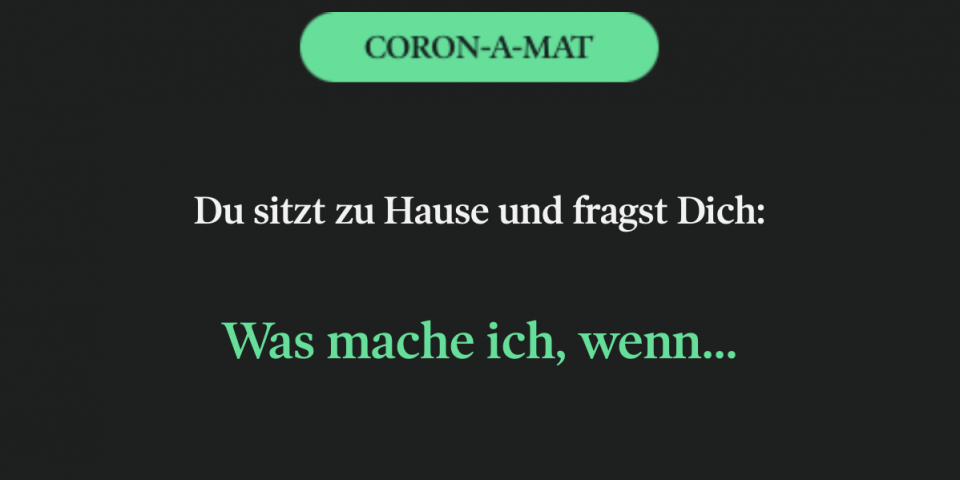 „Was brauchen die Menschen jetzt?“ – fragten wir uns, als das Covid-19-Virus Deutschland erreichte. Deswegen haben wir den Coron-A-Mat entwickelt, das digitale Tool zur Bekämpfung von Langeweile, Stress und Sorgen sowie der Motivator für Eigeninitiative und Engagement. Per Zufall spuckt der Coron-A-Mat Quarantäne-Tipps für jede Lebenslage aus. Die inspirierenden, aufheiternden und unterhaltenden Quarantäne-Tipps sorgen dafür, dass die Menschen die Ausgangsbeschränkungen besser einhalten und überstehen.