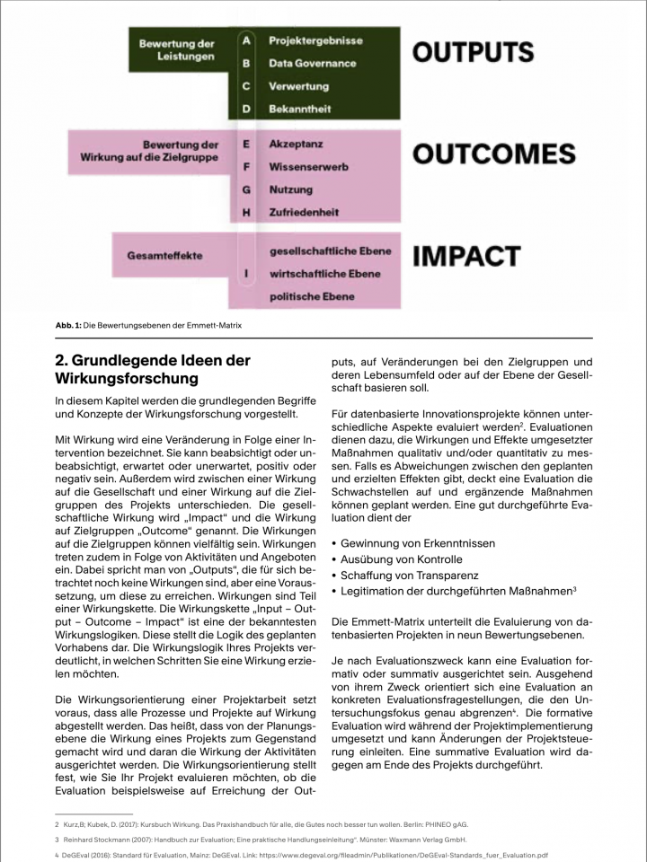 Für eine effiziente datenbasierte Projektarbeit sind Begriffe wie Wirkung, Wirkungsorientierung und Projektevaluation wichtig. Dabei kommt es darauf an, eindeutige Projektziele zu formulieren und diese im Laufe eines Projekts zu überprüfen. Wir beschäftigen uns im Leitfaden mit den Ideen der Wirkungsforschung, den Phasen von Wirkungsorientierung und den Möglichkeiten, wie Wirkungsorientierung die Projektarbeit praktisch unterstützen kann.